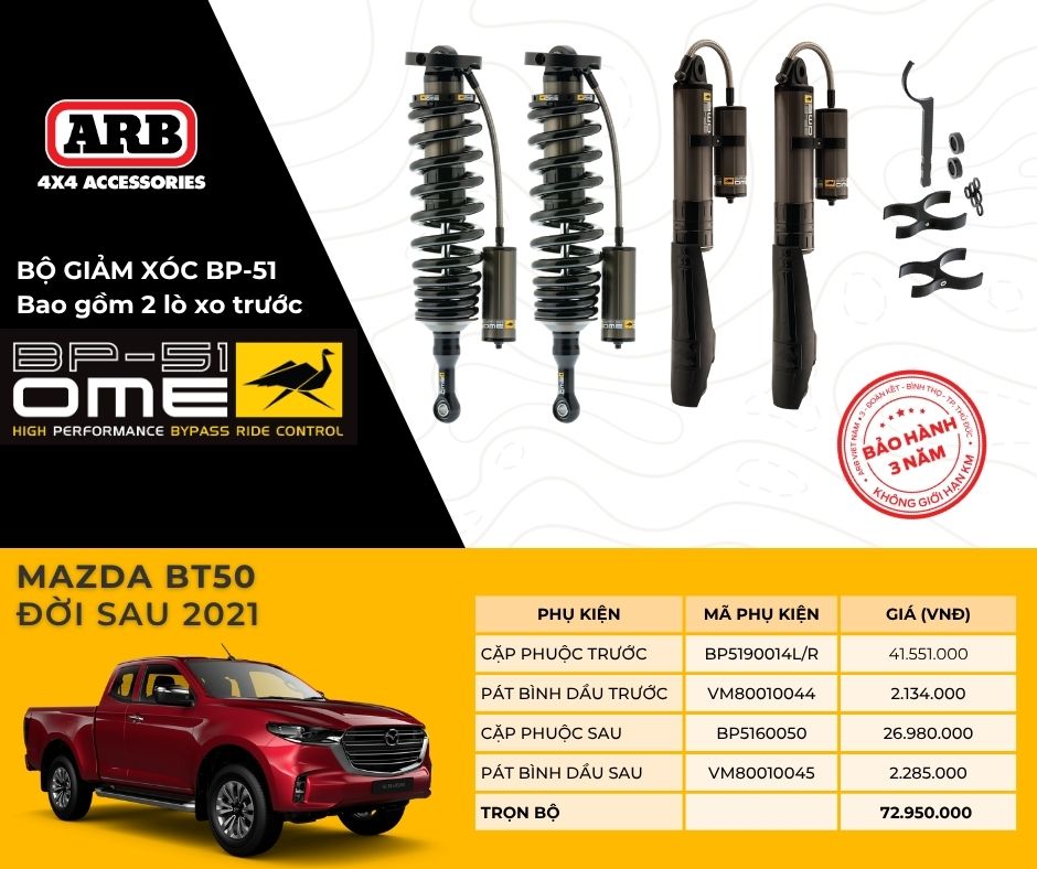 Giảm xóc BP-51 là một trong những dòng giảm xóc cao cấp nhất hiện nay, được ưa chuộng bởi những người đam mê độ xe và yêu cầu cao về khả năng vận hành của xe. Được sản xuất bởi ARB, một thương hiệu nổi tiếng trong lĩnh vực phụ tùng và phụ kiện off-road, BP-51 mang đến những ưu điểm vượt trội so với các dòng giảm xóc thông thường.