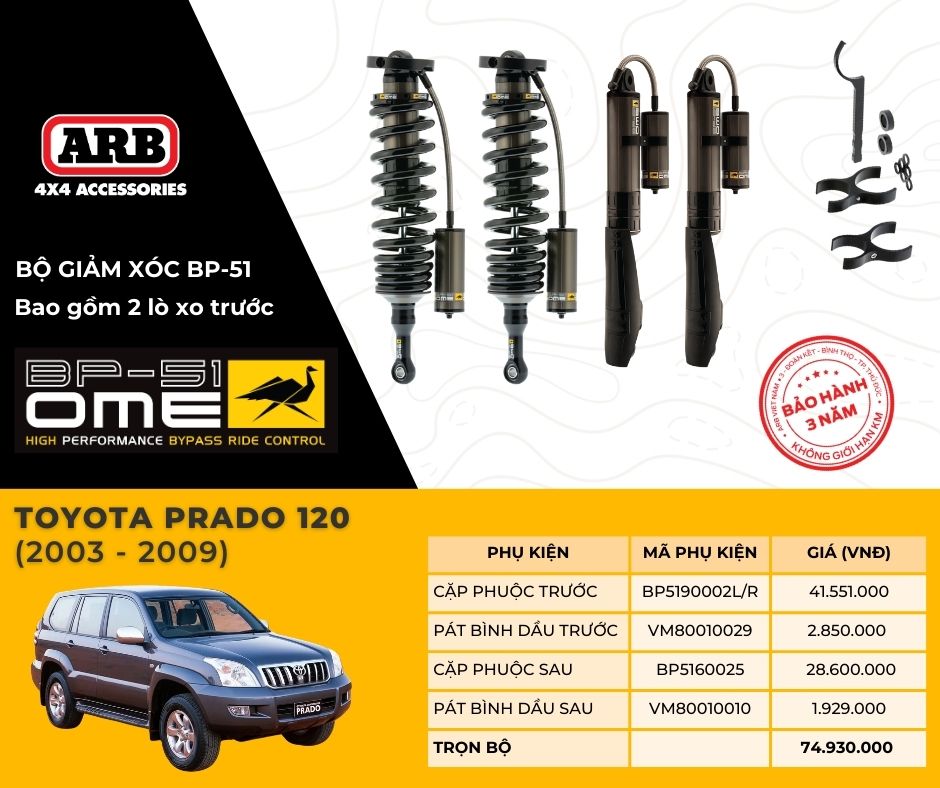 Giảm xóc BP51 là một trong những dòng giảm xóc cao cấp nhất hiện nay, được ưa chuộng bởi những người đam mê độ xe và yêu cầu cao về khả năng vận hành của xe. Được sản xuất bởi ARB, một thương hiệu nổi tiếng trong lĩnh vực phụ tùng và phụ kiện off-road, BP-51 mang đến những ưu điểm vượt trội so với các dòng giảm xóc thông thường.