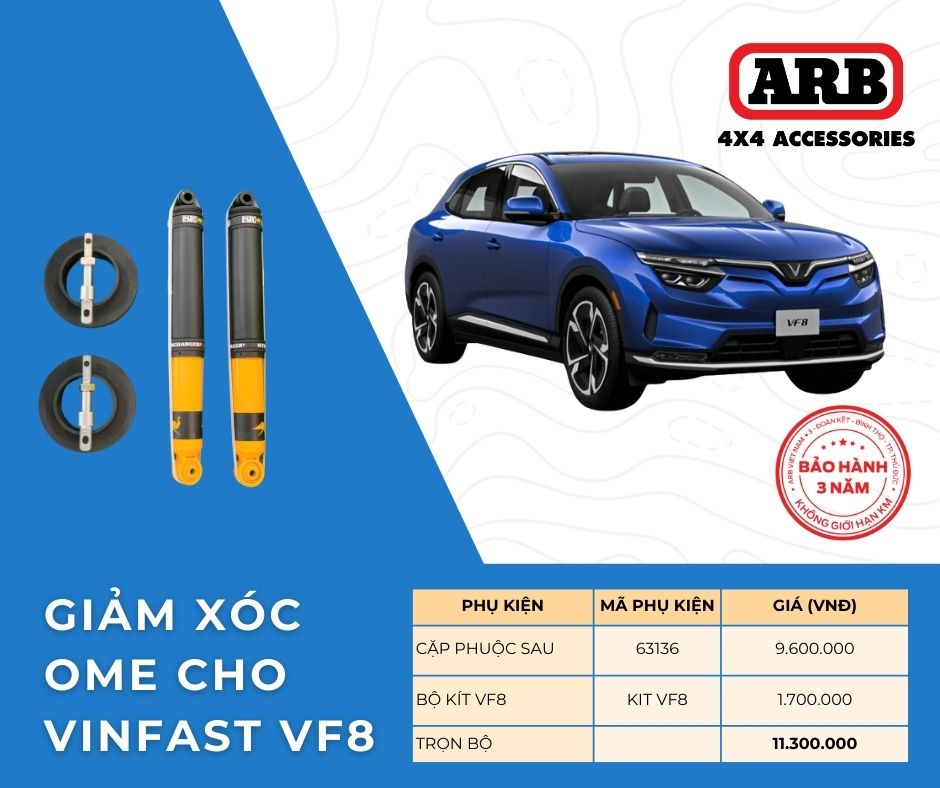 Với 50 năm kinh nghiệm, những phụ kiện của ARB không chỉ tốt, bền mà có giá thành rất hợp túi tiền. Cũng vì chất lượng vượt trội nên các dòng phuộc giảm xóc hiệu OME của ARB đều được bảo hành tới 3 năm không giới hạn km.