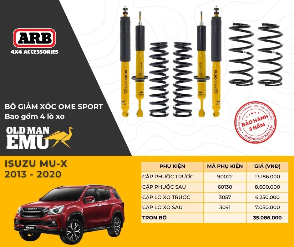 Phuộc giảm xóc khí Nitro hiệu Old Man Emu là sản phẩm tiên tiến nhất của ARB, đây là loại phuộc bán chạy nhất trên thị trường phuộc giảm xóc dành cho xe bán tải và SUV. Đội ngũ kỹ sư OME đã nghiên cứu và thử nghiệm trong nhiều năm để cho ra đời một loại phuộc dẫn đầu về độ bền, tính năng vận hành, độ chính xác và sự tiện nghi tối đa trong điều kiện đường xá xấu nhất.